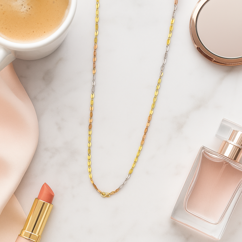 Descubre la delicada belleza y sofisticación de nuestra cadena estilo grano de café (serpentina) en auténtico oro de 10 quilates, perfecto con tres colores blanco, amarillo y rosa oro, para quienes buscan un toque refinado sin sacrificar ligereza ni comodidad.