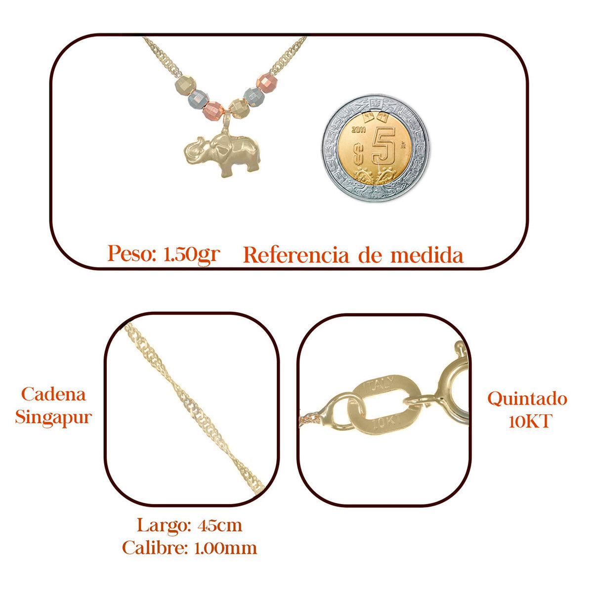 Esta exquisita gargantilla de oro italiano de 10 quilates, embellecida con bolas multicolores y un encantador dije de elefante inflado, es una adición perfecta y sofisticada a cualquier colección de joyería fina. Hecha con oro auténtico de 10 quilates, esta pieza garantiza un equilibrio ideal entre lujo, durabilidad, y resistencia. La gargantilla destaca por su diseño único que incorpora un toque multicolor y un estilo de cadena Singapur diamantado, proporcionando un brillo excepcional y un contraste encantador.ESPECIFICACIONES:Medida: 45 cmPeso: 1.5 GramosQuilataje: 10K (NO ES CHAPA NI BAÑO DE ORO)PREGUNTAS FRECUENTES:¿Es adecuada para el uso diario?R= Sí, fabricada en oro de 10K, esta gargantilla combina la belleza con la funcionalidad, siendo perfecta para el uso diario y para resaltar su elegancia en cualquier momento.¿La gargantilla viene con algún tipo de certificación de autenticidad?R= Cada gargantilla viene con un certificado de autenticidad, asegurando su pureza y calidad, junto con el sello del fabricante y el país de origen, Italia.¿Qué tipo de cierre tiene la gargantilla?R= Incluye un broche de argolla, conocido por su seguridad y facilidad de uso, que se integra perfectamente con el diseño de la cadena.¿Ofrecen envío gratuito?R= Ofrecemos opciones de envío rápido y seguro. Consulta nuestra página para más detalles sobre la entrega.Para más información y para explorar nuestra colección completa, visita https://www.mercadolibre.com.mx/pagina/imperialjewlery. Esta gargantilla de oro de 10K es la elección perfecta para quienes buscan una joya significativa y elegante, perfecta para cualquier ocasión. ¡Adquiere esta belleza atemporal hoy!