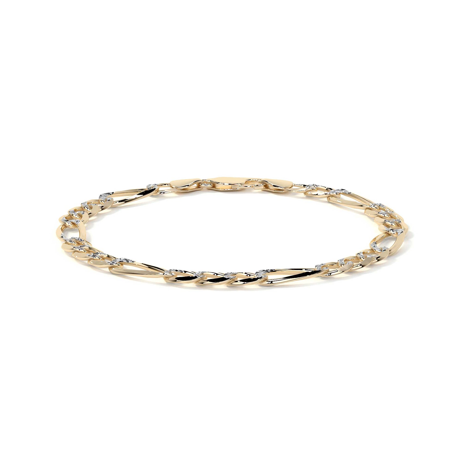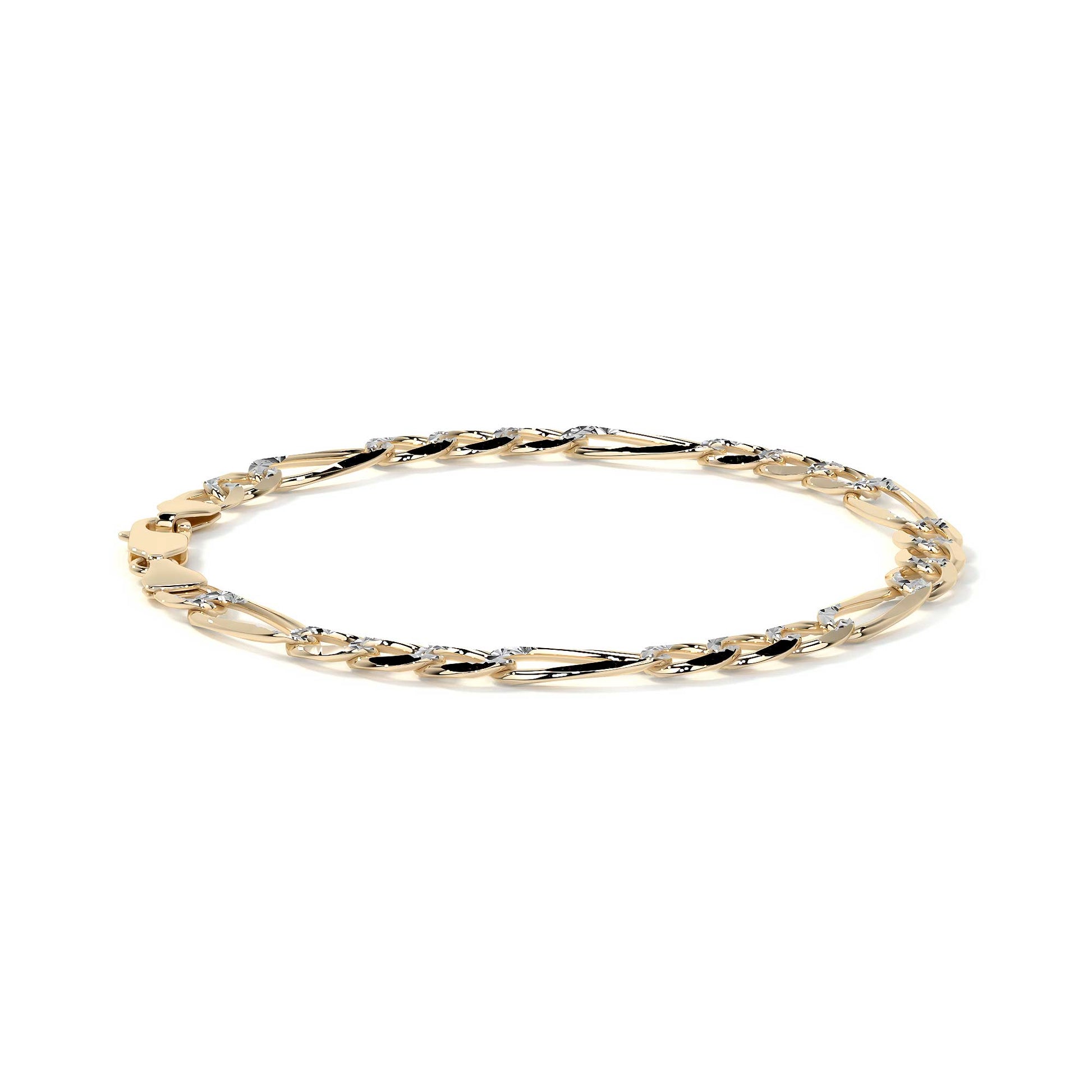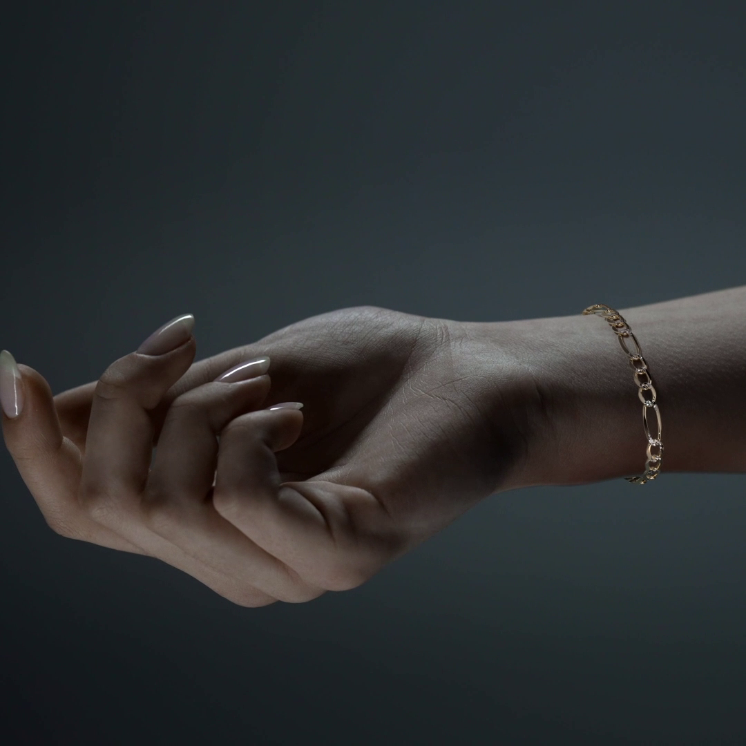El estilo Fígaro 3x1 Pavé presenta eslabones sólidos cuidadosamente trabajados para ofrecer una apariencia refinada y elegante. Con un calibre de 6 mm, esta pulsera brinda una presencia robusta y sofisticada, ideal para el uso diario o para ocasiones especiales.
