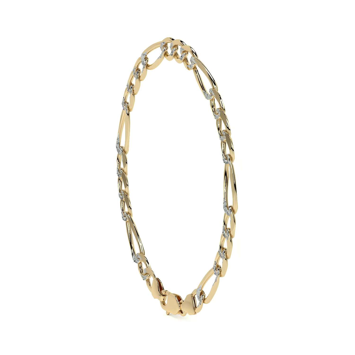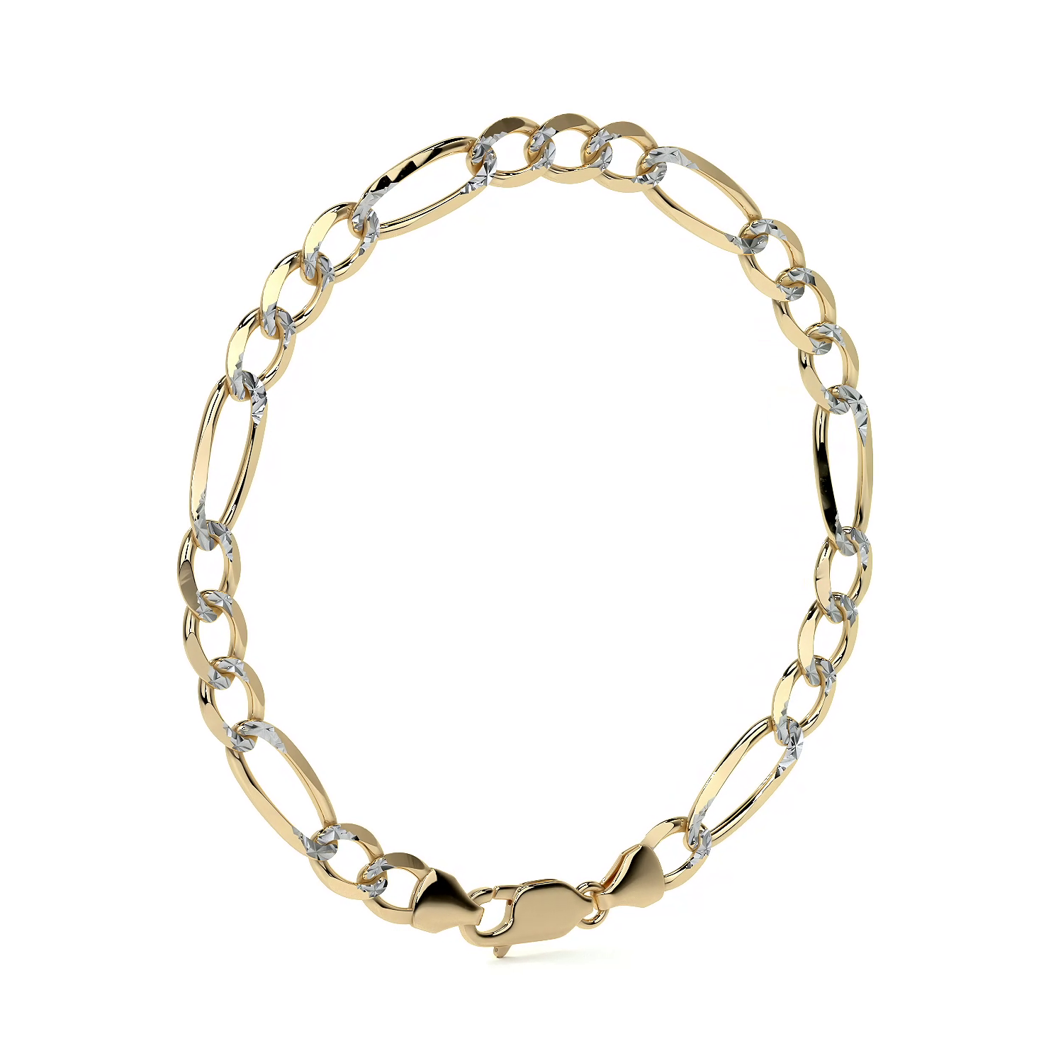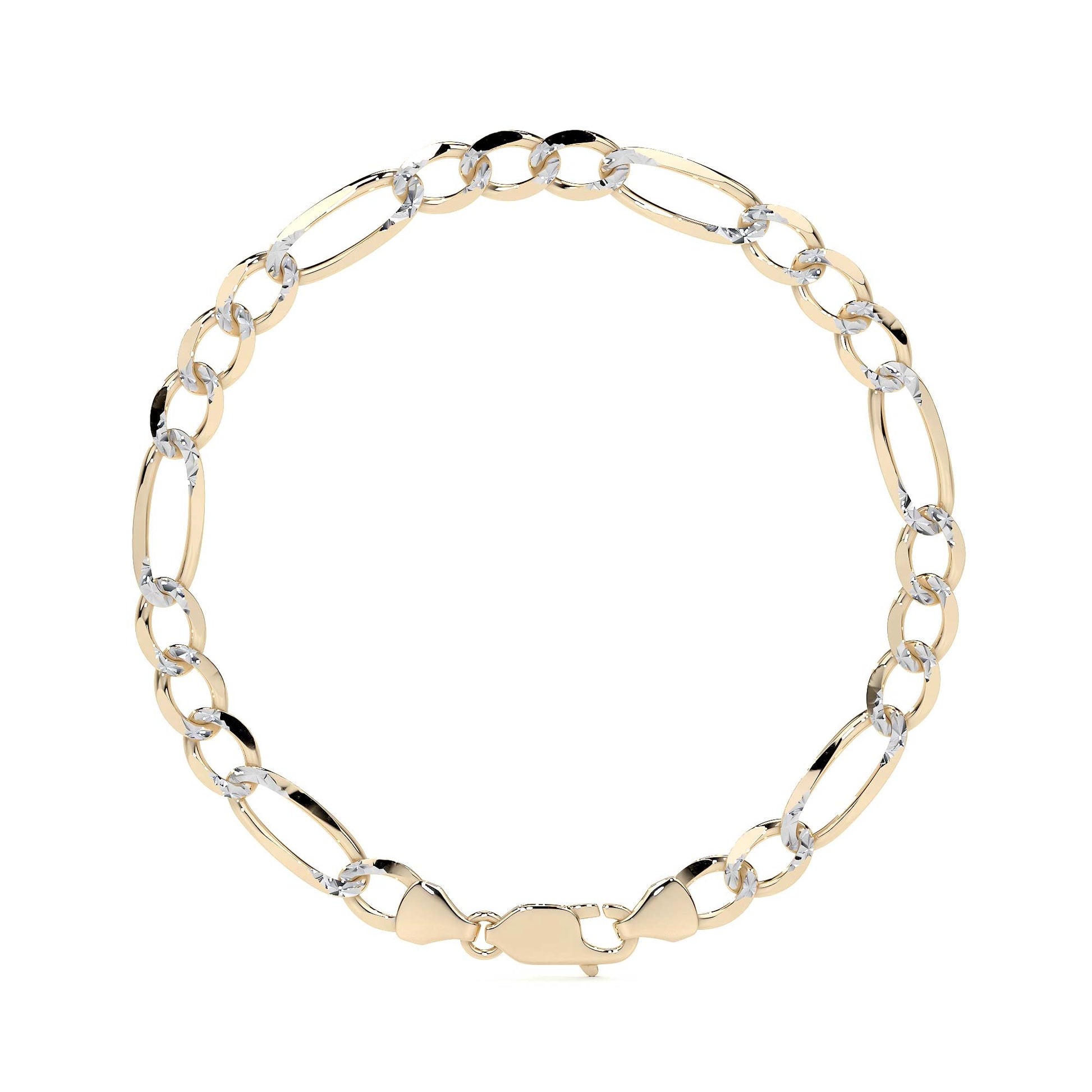 El estilo Fígaro 3x1 Pavé presenta eslabones sólidos cuidadosamente trabajados para ofrecer una apariencia refinada y elegante. Con un calibre de 6 mm, esta pulsera brinda una presencia robusta y sofisticada, ideal para el uso diario o para ocasiones especiales.